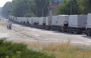 Ormai circa la metà dei 280 camion carichi di acqua, generatori e sacchi a pelo destinati alle popolazioni civili dell'Ucraina orientale sono entrati nel territorio ucraino e hanno attraversaro il valico di Izvaryne, in mano ai ribelli separatisti filorussi. Una ventina di convogli hanno raggiunto il centro della città di Lugansk, ancora in mano ai ribelli. Tuttavia, in mattinata, i primi cinque camion del convoglio entrato senza l'autorizzazione sono rientrati in territorio russo. Altri mezzi si stanno avvicinando alla frontiera. Intanto, colpi di artiglieria hanno ucciso due civili nel centro di Donetsk, roccaforte dei separatisti filorussi nell'est del Paese.