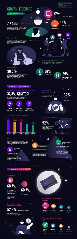 Con la progressiva digitalizzazione dei pagamenti emerge con forza il tema della gestione del denaro non più solo fisico ma digitale. Strumento preferenziale per l’utilizzo dei più giovani – che difficilmente avrebbero accesso a bancomat, conti correnti strutturati e carte di credito – sono le carte di debito o carte prepagate. Il 68,7% dei genitori dichiara di conoscerli come strumenti finanziari e di possederne almeno uno, mentre il 27,2% pur conoscendoli non ne possiede, infine, solo il 2% non sa di cosa si tratti. Tra i giovani la consapevolezza è leggermente più bassa: il 60,7% dei ragazzi conosce le carte di debito e oltre la metà di loro (più del 60%) ha sentito parlare di carte prepagate studiate appositamente per giovani.