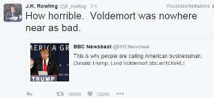 Donald Trump e' piu' cattivo di Voldemort: parola di JK Rowling,la scrittrice che insieme a Harry Potter ha creato il suo antagonista, il detentore della magia oscura, capo dei Mangiamorte. "Voldemort non e' stato mai cosi' cattivo", ha twittato l'autrice, a smentire i paragoni fin troppo ottimistici tra il "Colui-che-non-va-nominato" e il candidato alla nomination dei Repubblicani per le presidenziali americane del 2016. Ad accostare la figura di Voldemort a quella del miliardario ci avevano pensato i social, mettendo l'una accanto all'altra le figure dei due in un caratteristico atteggiamento dispotico, e qualche ora dopo che Trump aveva chiesto alle autorita' il divieto di ingresso ai musulmani negli Stati Uniti.