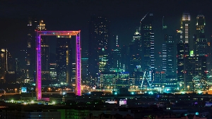 Un sistema dinamico di LED cangianti illumina la Dubai Frame, attrazione turistica apena inaugurata e oggetto di una delicata controversia legale internazionale.
